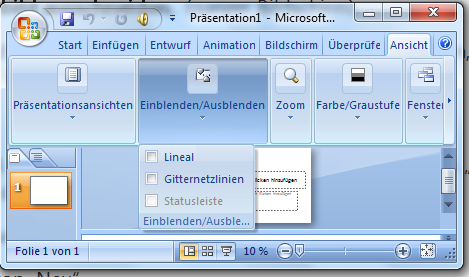 Wenn Sie z.B. von MS Powerpoint eine Hardcopy mit geöffneten "Einblenden/ Ausblenden“ Menu erstellen wollen, wird bei drücken der "Neu“ Taste das Menu geschlossen.