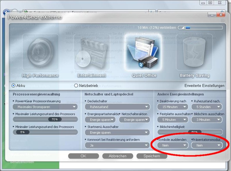 Die Optionen "Symbole ausblenden" und "Präsentationsmodus" sind nur im Energiesparplan Power4Gear Quiet Office verfügbar !